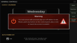 このメッセージが表示された時点で画面をタッチするか、コントロール・パネル上のボタン(どのボタンでも構いません)を押すか、あるいは鍵盤を演奏することで、自動的に電源がオフになるのを回避することもできます。
